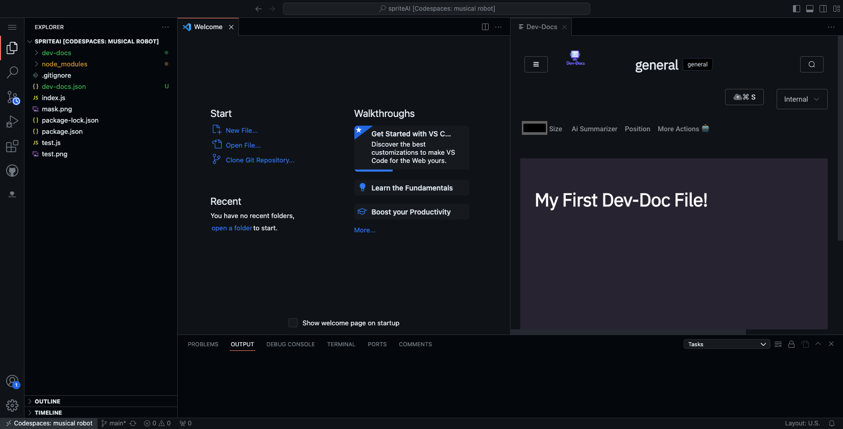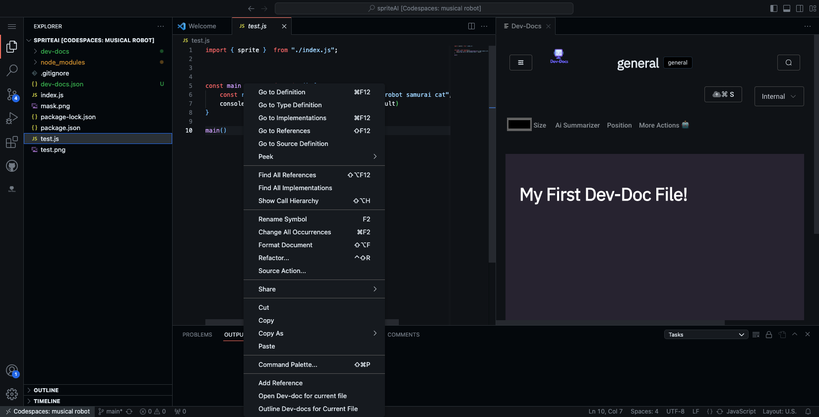Open the command palette with shift command p and click/select: dev-docs: Initialize Dev-Docs. This creates a dev-docs.json file that you can use to configure Dev-Docs.